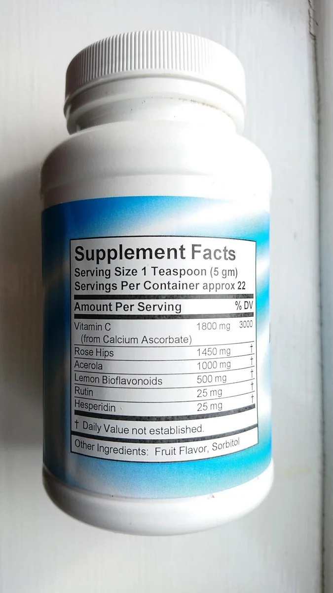 Ascorbate C Powder (4 oz) One teaspoon (5 gm) supplies Vitamin C (Calcium Ascorbate) 1800 mg., Rose Hips 1450 mg., Acerola 1000 mg., Lemon Bioflavonoids 500 mg., Rutin 25 mg., Hesperidin 125 mg.