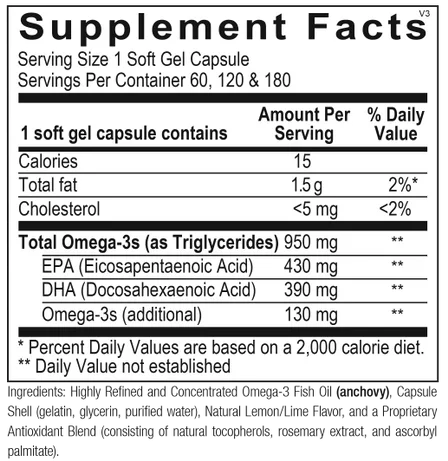 Other Ingredients: Highly Refined and Concentrated Omega-3 Fish Oil (anchovy), Capsule Shell (gelatin, glycerin, purified water), Natural lemon/Lime Flavor, and a Proprietary Antioxidant Blend (consisting of natural tocopherols,